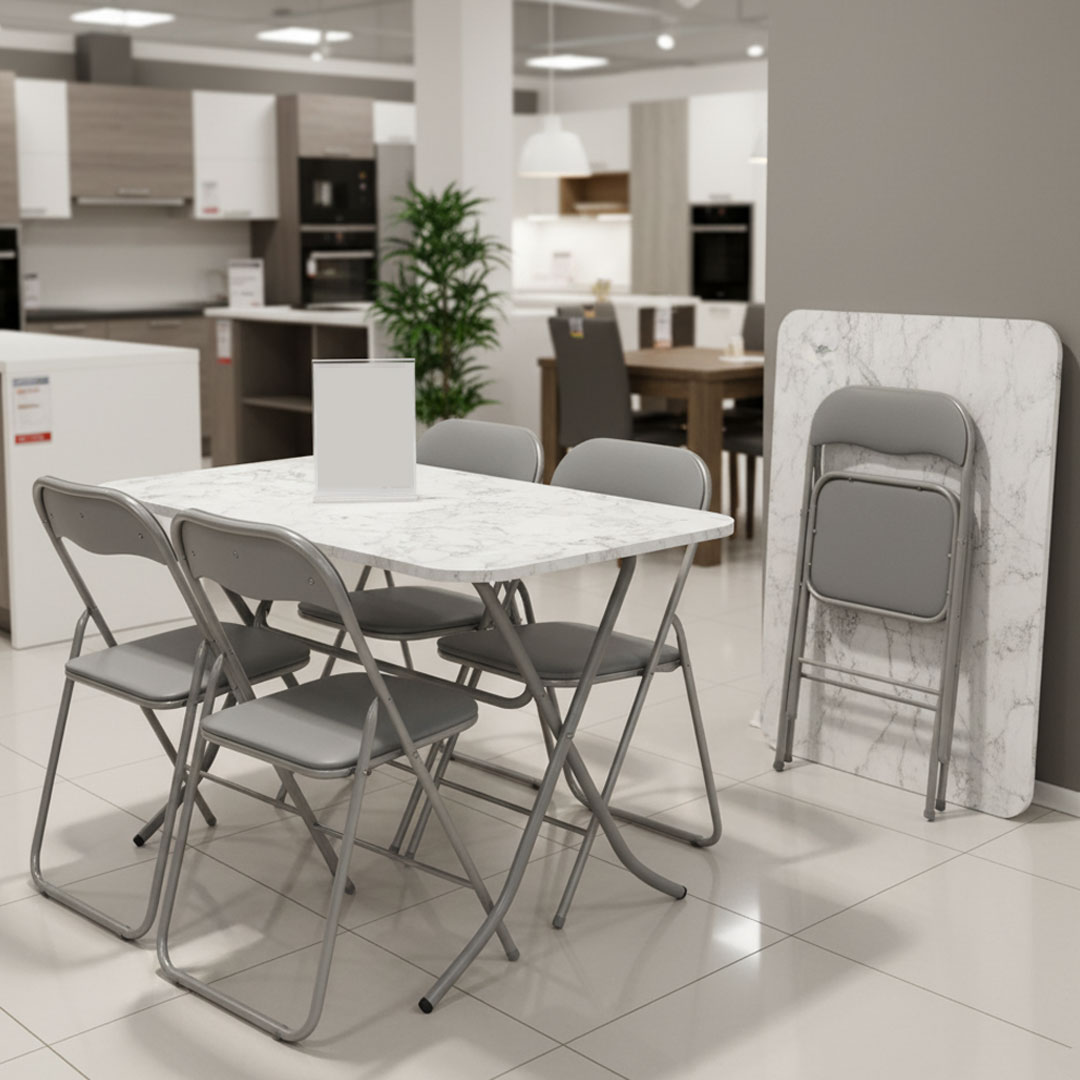 Praktična i funkcionalna trpezarijska garnitura koju čine sklopivi sto i 4 sklopive stolice. Bez obzira na veličinu vašeg prostora, ovaj komplet pruža idealno rešenje za svakodnevne obroke, porodična okupljanja ili uživanje u jutarnjoj kafi.