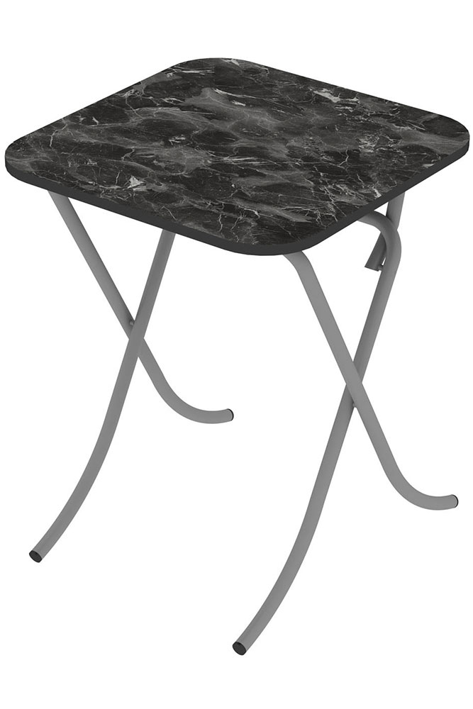 Sklopivi sto u boji crnog mermera. Ploča stola je napravljena od iverice a nogari od metala prečnika 25 mm. Dimenzije 60 x 60 x 75 cm.