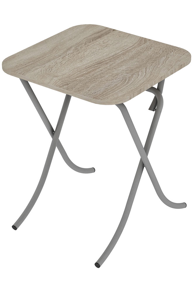 Sklopivi sto u boji hrasta. Ploča stola je napravljena od iverice a nogari od metala prečnika 25 mm. Dimenzije 60 x 60 x 75 cm.