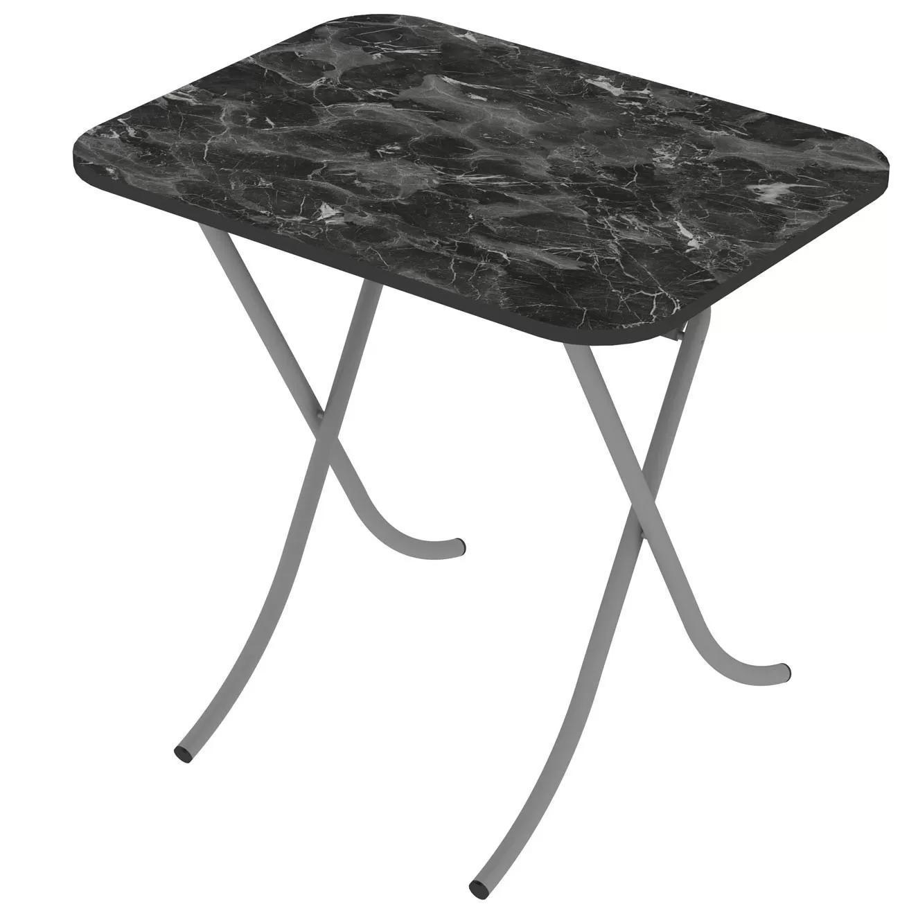 Sklopivi sto u boji crnog mermera. Ploča stola je napravljena od iverice a nogari od metala prečnika 25 mm. Dimenzije 60 x 80 x 75 cm.
