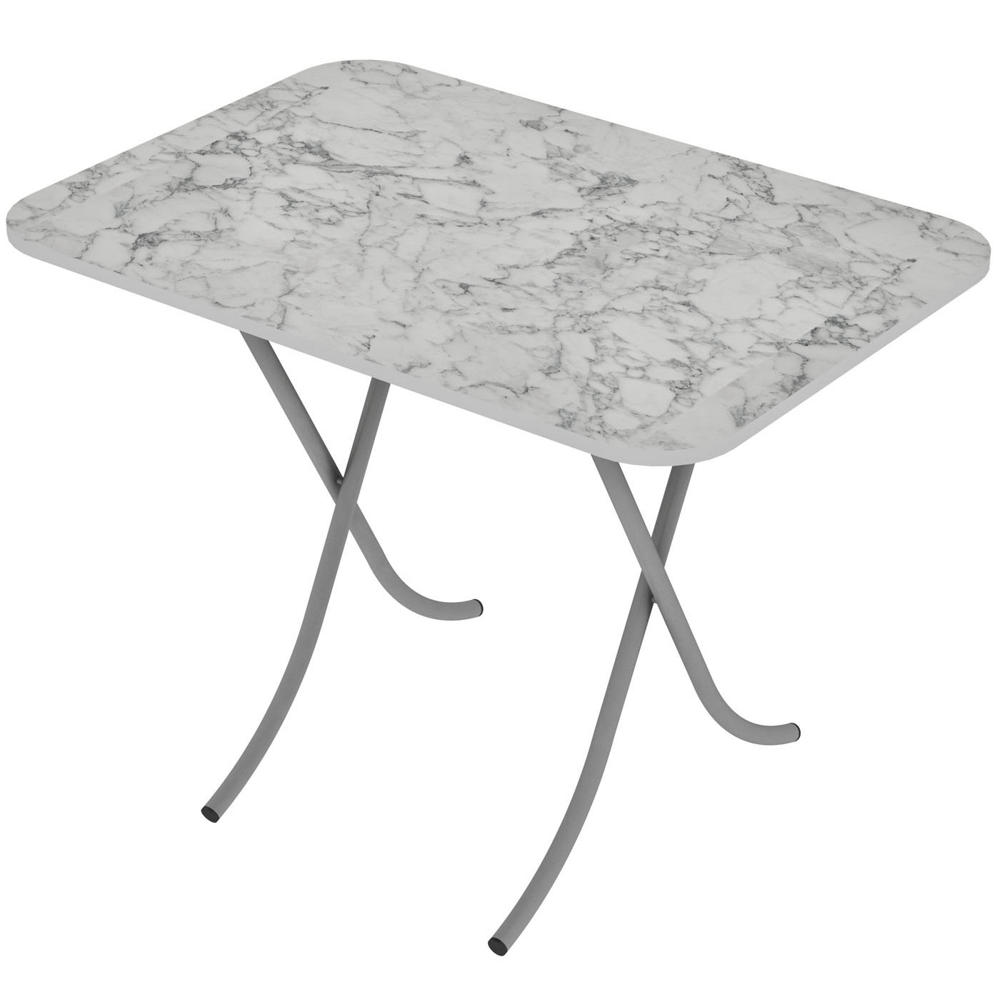 Sklopivi sto u boji belog mermera. Ploča stola je napravljena od iverice a nogari od metala prečnika 25 mm. Dimenzije 70 x 100 x 75 cm.