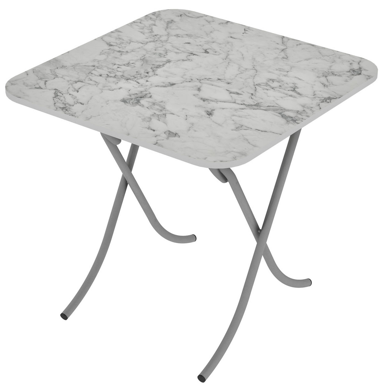 Sklopivi sto u boji belog mermera. Ploča stola je napravljena od iverice a nogari od metala prečnika 25 mm. Dimenzije 80 x 80 x 75 cm.