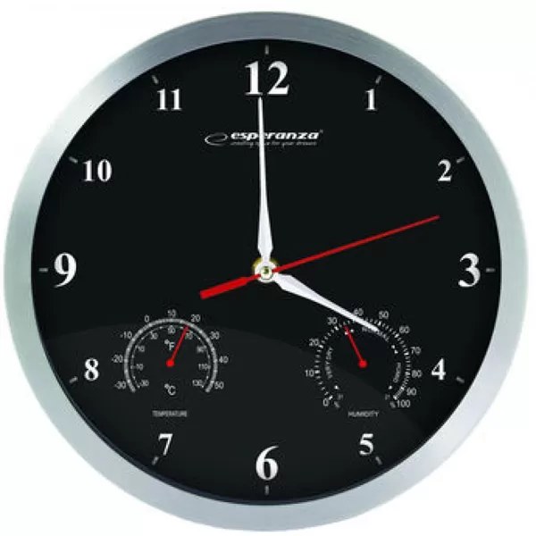Zidni sat sa tihim mehanizmom koji osim tačnog vremena prikazuje temperaturu i procenat vlažnosti vazduha.