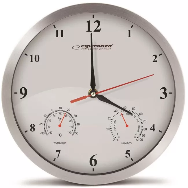Zidni sat koji osim tačnog vremena prikazuje temperaturu i procenat vlažnosti vazduha. Sa tihim mehanizmom.