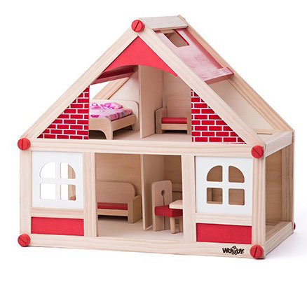 Drvena kućica za lutke sa četiri lako dostupne prostorije i nameštajem. Naravno, tu su i dve lutkice koje će se rado useliti. Dimenzije: 38x36x23cm.