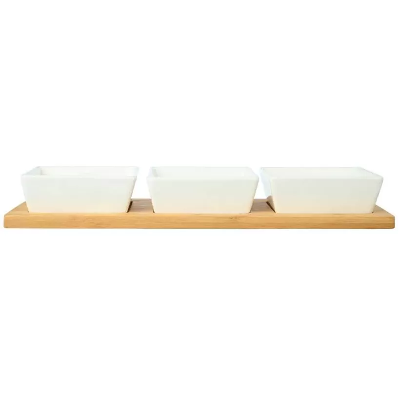 Set od 4 dela za serviranje predjela i grickalica. Set se sastoji od tri činije i daske od bambusa. Činije su izrađene od kvalitetnog porcelana, dok je postolje izradjeno od prirodnog bambusovog drveta.