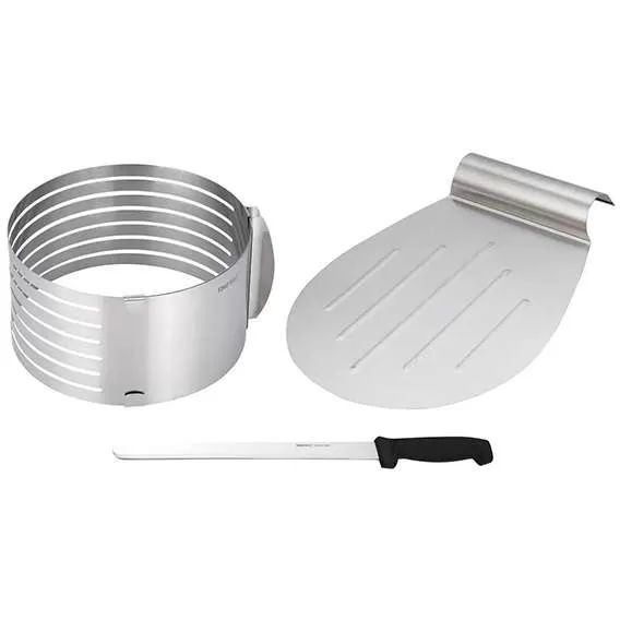 Modla za tortu sa nožem i plehom za sečenje. Podesivi prsten sa dve pokretne ručke omogućva da sečete testo različitih prečnika (16-20cm).