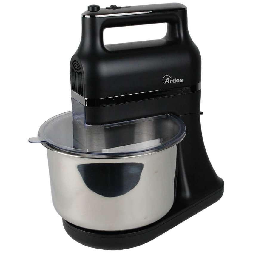 Električni ručni mikser sa samorotirajućom posudom od nerđajućeg čelika zapremine 3,5 litara i providnim poklopcem koji štiti od prskanja. U kompletu su mutilice za meka i penasta testa i mešalice namenjene za polutvrda testa.
