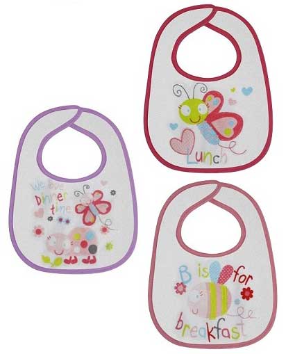 Tri lepe i praktične portikle za bebe sa natpisima Breakfast, Lunch, Dinner. Napravljene su od pamuka i postavljene plastičnom folijom da se fleke od...