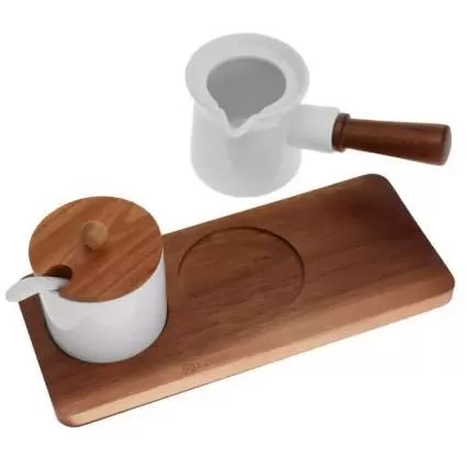 Praktičan komplet koji sadrži porcelanske posude za šećer i mleko, na postolju od bambusa. Set koji je neizostavan prilikom posluživanja kafe ili čaja gostima.
