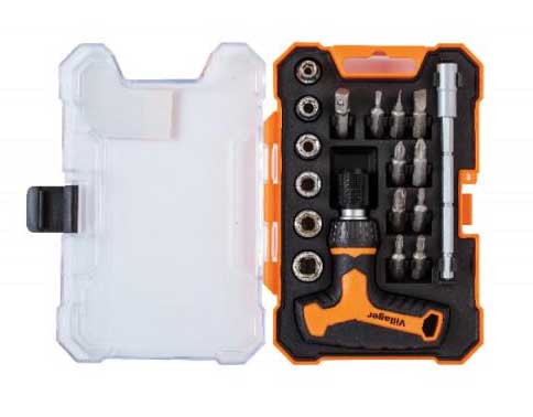 U funkcionalu kutiju smeštena je T drška odvijača, brojni nastavci za šrafove i gedore. Svi nastavci se montiraju na ovu univerzalnu dršku. Komplet koji štedi prostor.